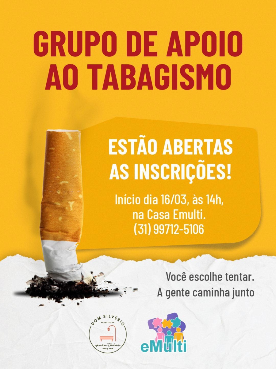 A Prefeitura de Dom Silvério, por meio da equipe eMulti, está com inscrições abertas para o Grupo de Apoio ao Tabagismo. Uma iniciativa que já tem ajudado moradores a retomarem o controle da própria saúde com acompanhamento profissional, orientação e apoio contínuo.