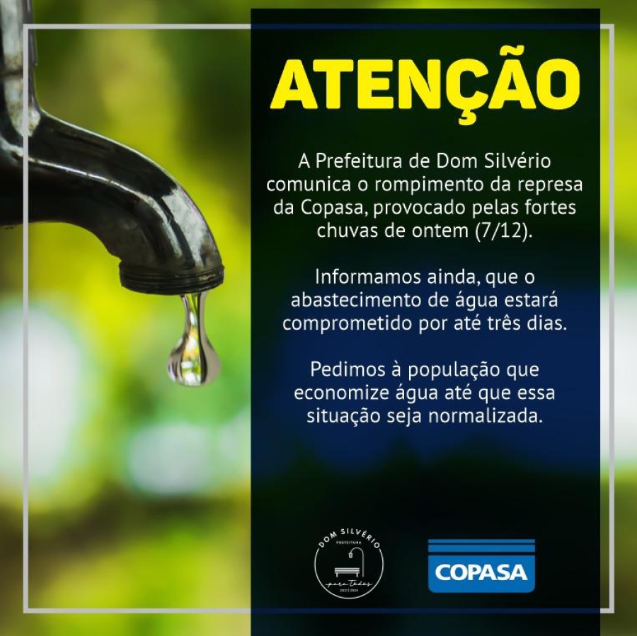 A Prefeitura de Dom Silvério comunica o rompimento da represa da Copasa, provocado pelas fortes chuvas de ontem (7/12).