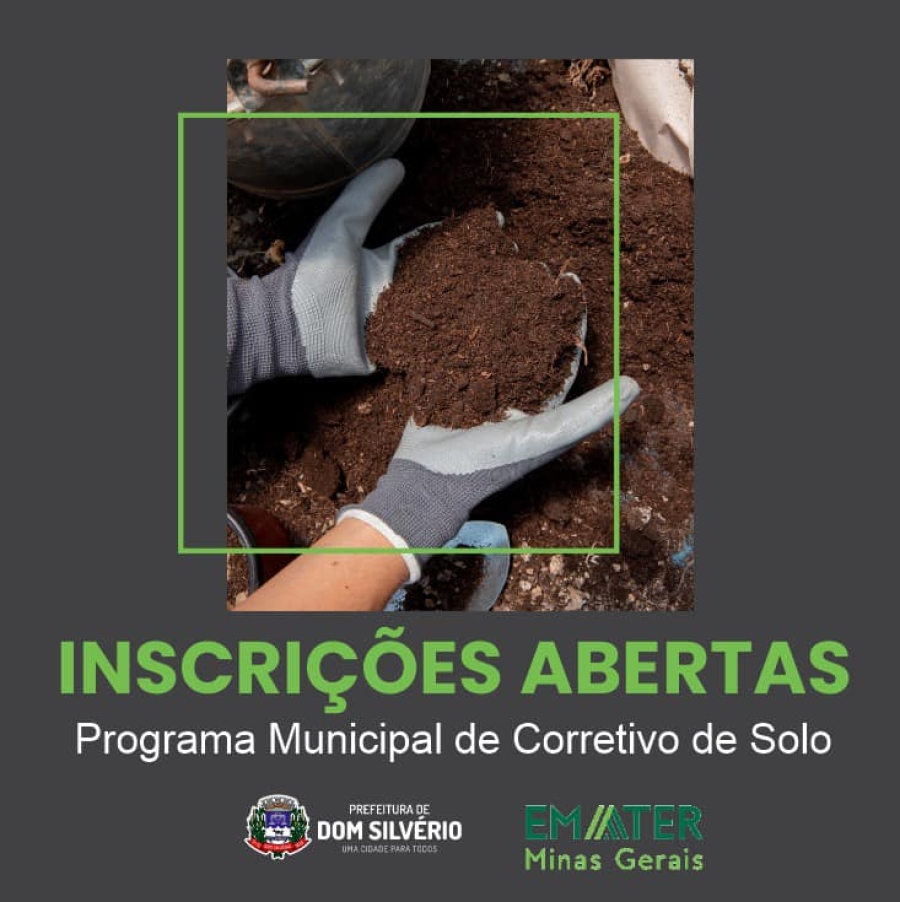 A EMATER-MG informa que estão abertas as inscrições para o Programa Municipal de Corretivo de Solo, em parceria com a Secretaria Municipal de Obras, Manutenção e Agricultura de Dom Silvério.