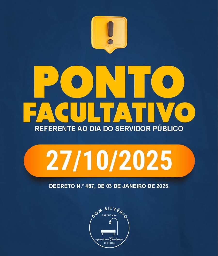 A Prefeitura de Dom Silvério informa que será ponto facultativo na próxima segunda-feira, 27 de outubro de 2025, em comemoração ao Dia do Servidor Público, conforme Decreto nº 487/2025.