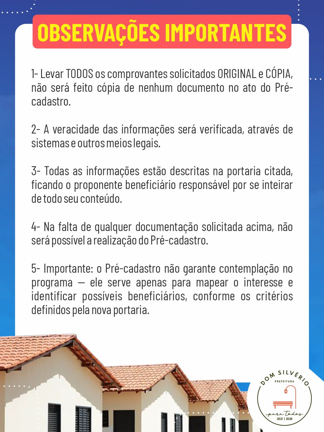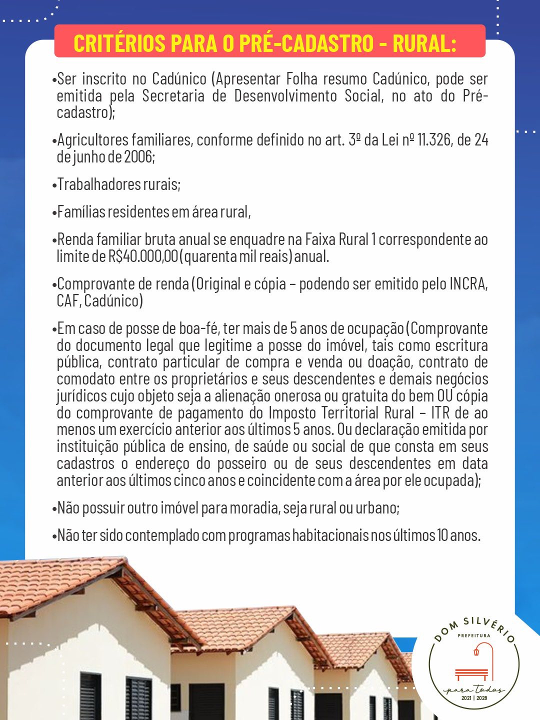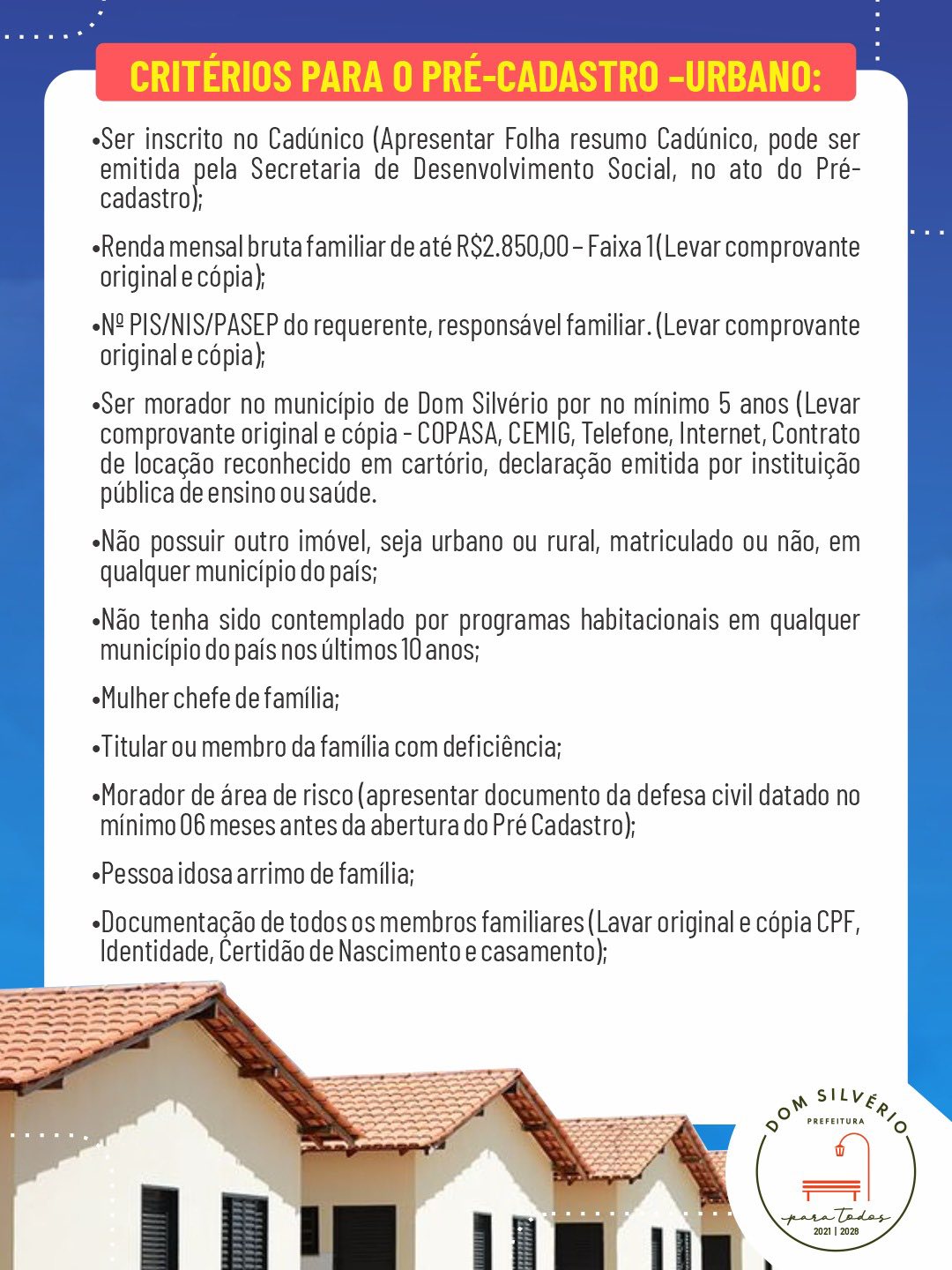 De 28 a 31 de outubro, das 08h30 às 12h e das 13h às 15h30, a Prefeitura de Dom Silvério, por meio da Secretaria de Desenvolvimento Social, realizará o PRÉ-CADASTRO para o Programa Minha Casa, Minha Vida – Urbano e Rural.