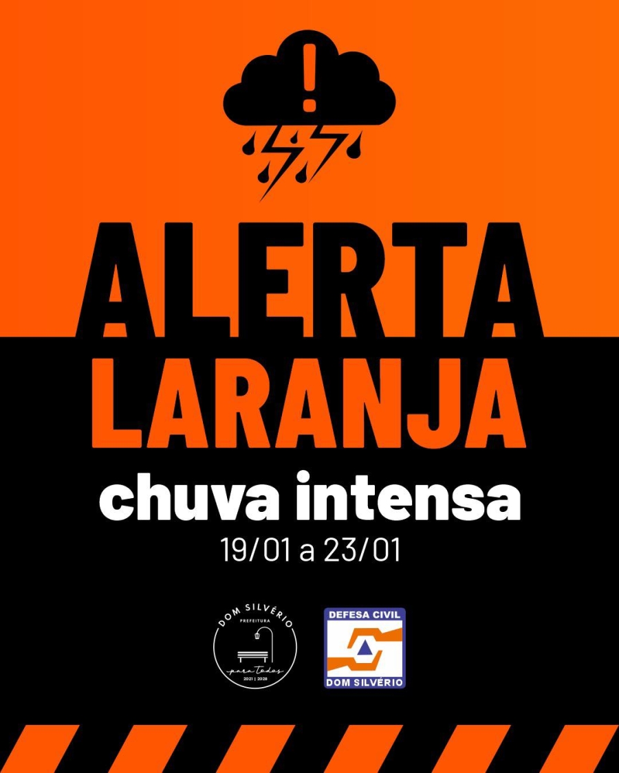 A Prefeitura de Dom Silvério alerta a população para o aviso laranja de chuva intensa emitido pelo Instituto Nacional de Meteorologia (Inmet) nesta segunda-feira (19), válido durante esta semana.